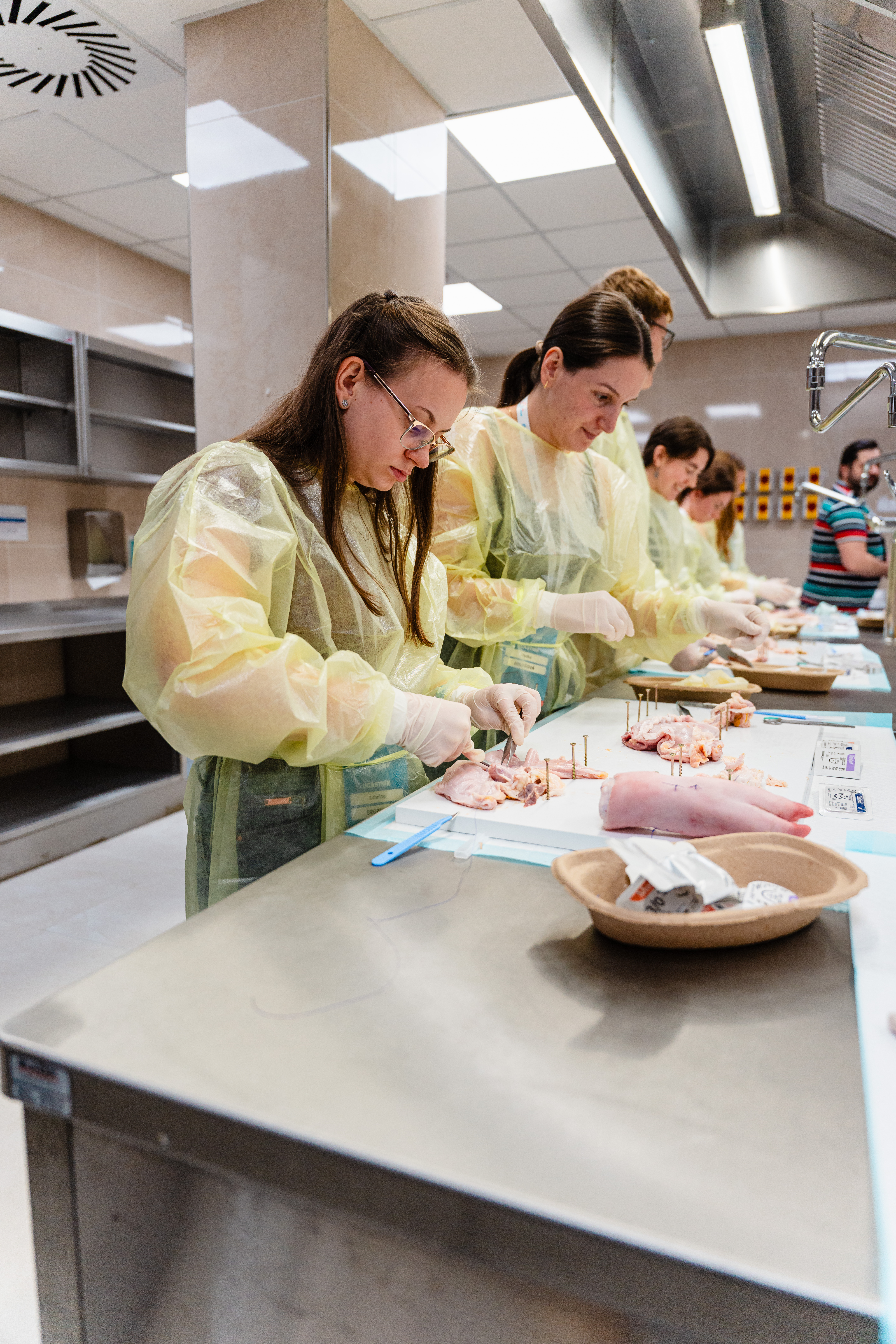 Na workshopu "Otevřená břišní chirurgie - šití žaludku, střev i aorty" jsme hned začali prakticky. Preparáty byly fajn. Lektoři byli nápomocný, ze začátku nás nechali pracovat samostatně a pak jsme rozebírali naše chyby a učili se, jak co zašít správně.